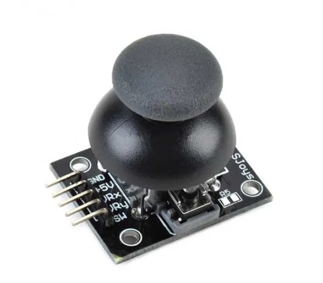 The Joystick module is similar to analog joysticks found in gamepads. It is made by mounting two potentiometers at a 90 degrees angle. The potentiometers are connected to a short stick centered by springs. This module produces an output of around 2.5V from X and Y when it is in resting position. Moving the joystick will cause the output to vary from 0v to 5V depending on its direction. If you connect this module to a microcontroller, you can expect to read a value of around 512 in its resting position (expect small variations due to tiny imprecisions of the springs and mechanism) When you move the joystick you should see the values change from 0 to 1023 depending on its position.