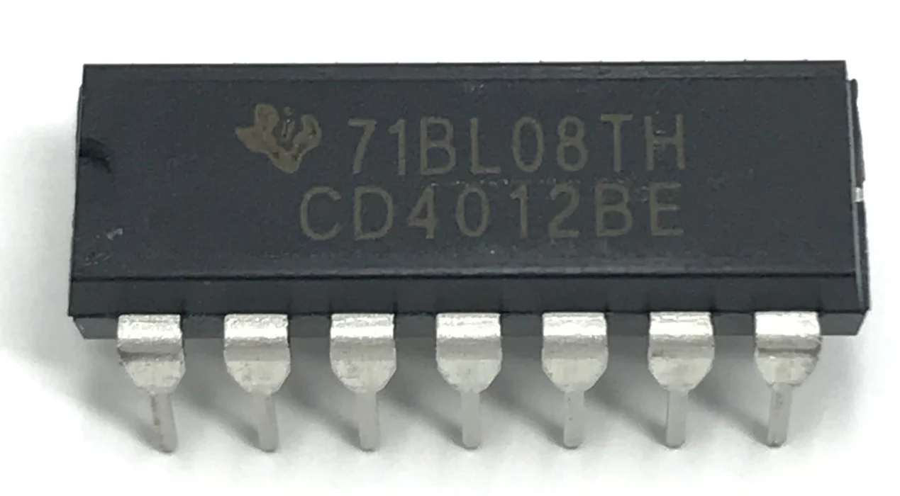 The CD4012 is a CMOS logic IC that contains two independent 4-input NAND gates. It performs the logic NAND function, where the output is LOW only when all inputs are HIGH. With wide voltage range operation and high noise immunity, it is suitable for a variety of logic applications.